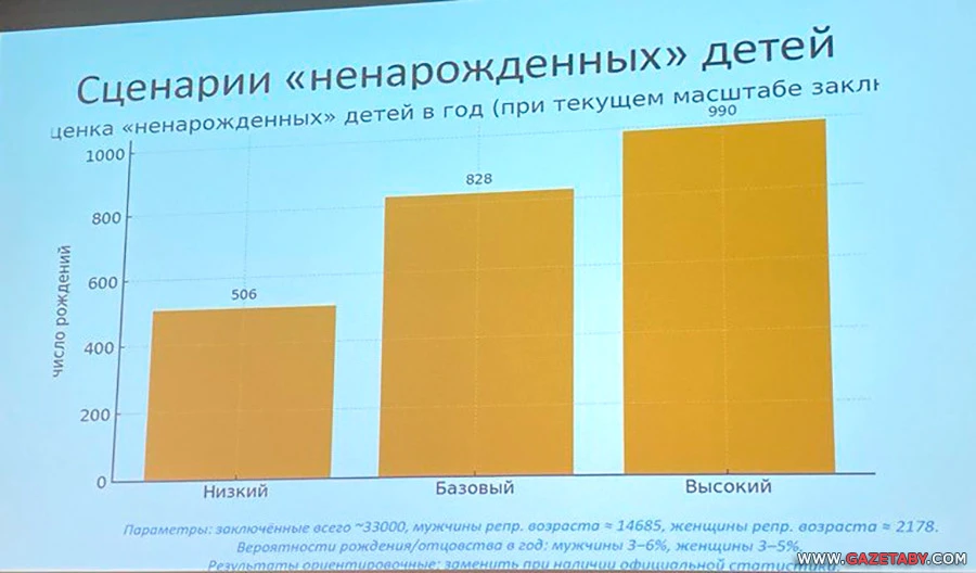 В базовом сценарии за год Беларусь теряет примерно 828 детей — тех, кто мог бы родиться, если бы не массовые «посадки». Это немало, если вспомнить, что в прошлом, 2024 году в нашей стране родилось всего 56 тысяч детей.