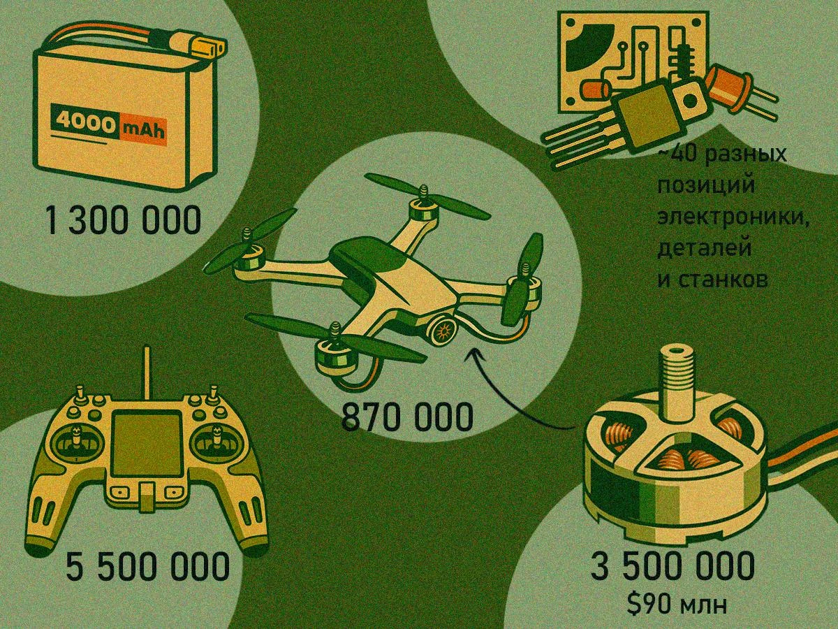 В течение трех лет «Рустакт» закупил у трех китайских компаний почти 3,5 млн электродвигателей на $90 млн. Этого хватило бы на сборку 870 тыс. коптеров. Кроме этого мы нашли поставки 1,3 млн литий-ионных аккумуляторов, 5,5 млн запчастей для радиоуправляемых моделей и еще около 40 разных позиций электроники, деталей и станков.